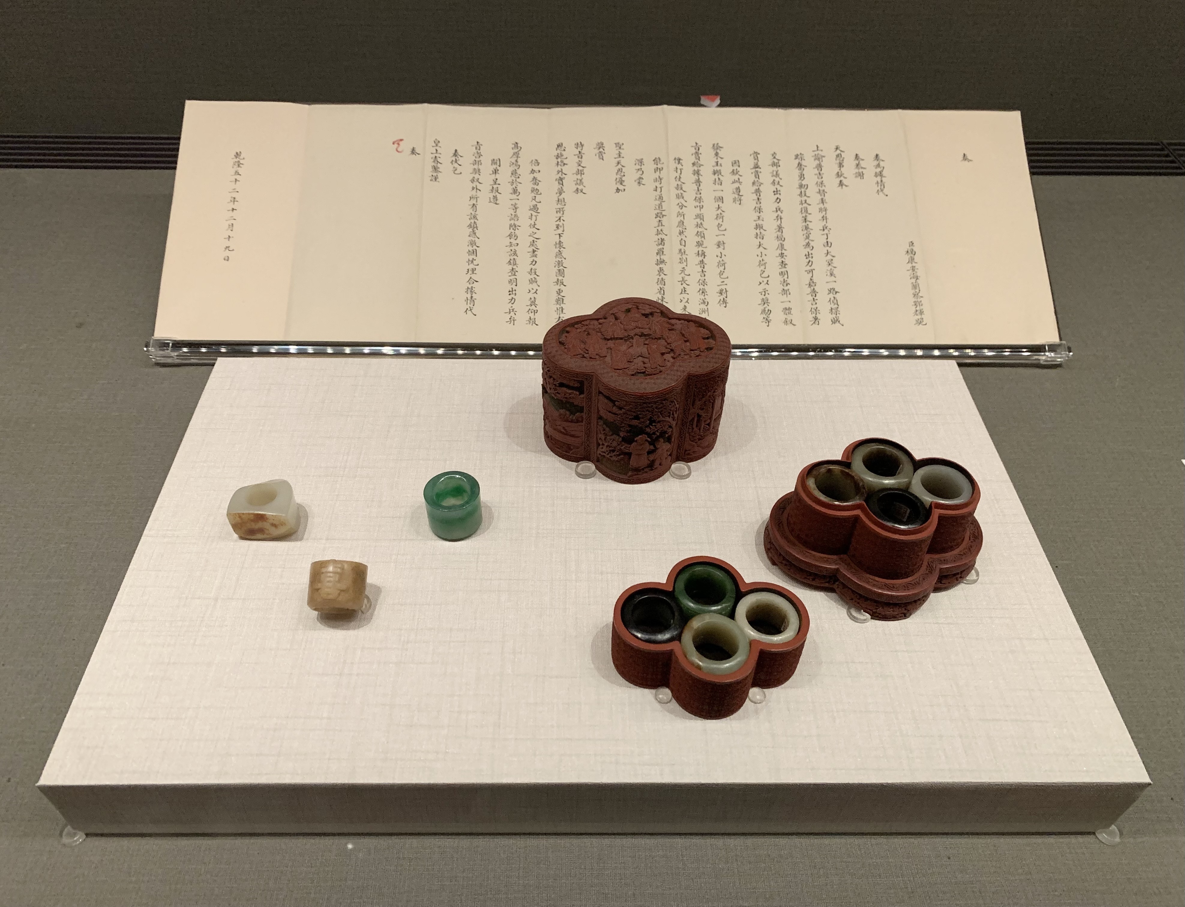 本次展覽精選皇帝賞賜的珍貴物件,從官帽裝飾的頂戴、湖綠釉翎管、粉彩瓷翎管,到清代滿族勇士隨身攜帶的火鐮荷包,更特別展出一組共二十件的〈清 乾隆粉彩御製詩花卉紋鼻煙壺〉,讓民眾一窺皇帝賞賜之禮的豐富多樣。此外,現代人喜歡在大拇指戴上戒指,這種套在大姆指的指環,在古代稱為韘,又稱作扳指,射箭時用來保護手指不被弓弦劃傷。除了有不忘滿族騎射傳統的深刻意涵,在乾隆皇帝積極推廣與賞賜下,帶動清代皇室貴族與官員配戴扳指的流行風潮,成為彰顯個人身分地位的飾品,也是皇帝御賜的禮品類型之一。