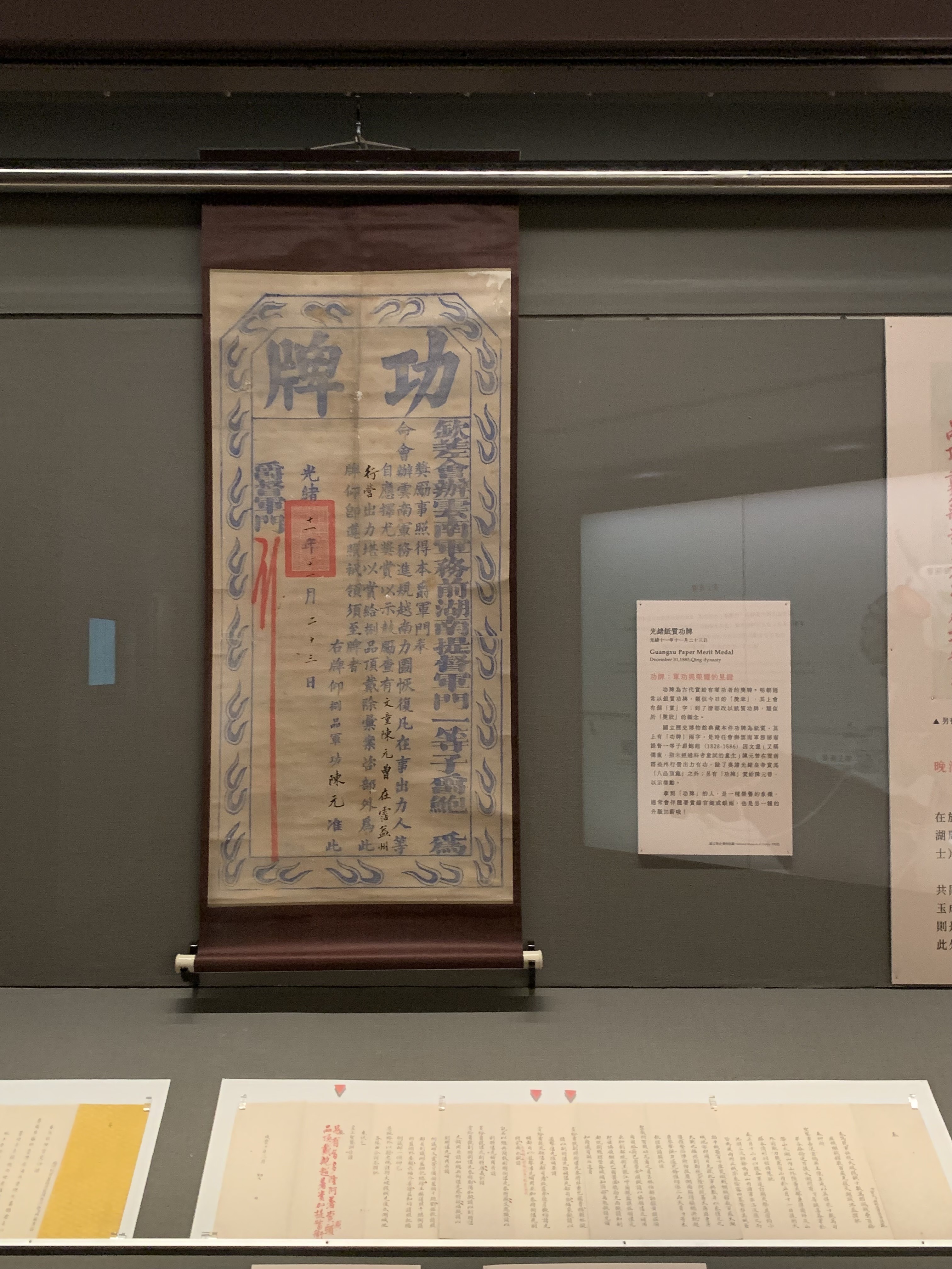 為豐富本次展覽內容,故宮特別向國立歷史博物館洽借兩件珍貴文物。〈光緒紙質功牌〉類似於今日「奬狀」,由時任會辦雲南軍務湖南提督一等子爵鮑超(1828-1886)奏請光緒皇帝,賞賜給在軍務上立有功勞的陳元,授予其「八品頂戴」,並加贈「功牌」,以示嘉獎。賞賜功牌不僅是一種榮譽象徵,通常還伴隨官銜晉升或賞賜銀兩,也是另一種的升職加薪。〈御賜雙龍寶星〉,則學習自西方各國頒給「勳章」的奬勵制度,最初是為了與西方國家外交往來,用來獎勵外國使節、軍官及商人,後來也開始授予清朝官員,成為清代賞賜制度中的一環。