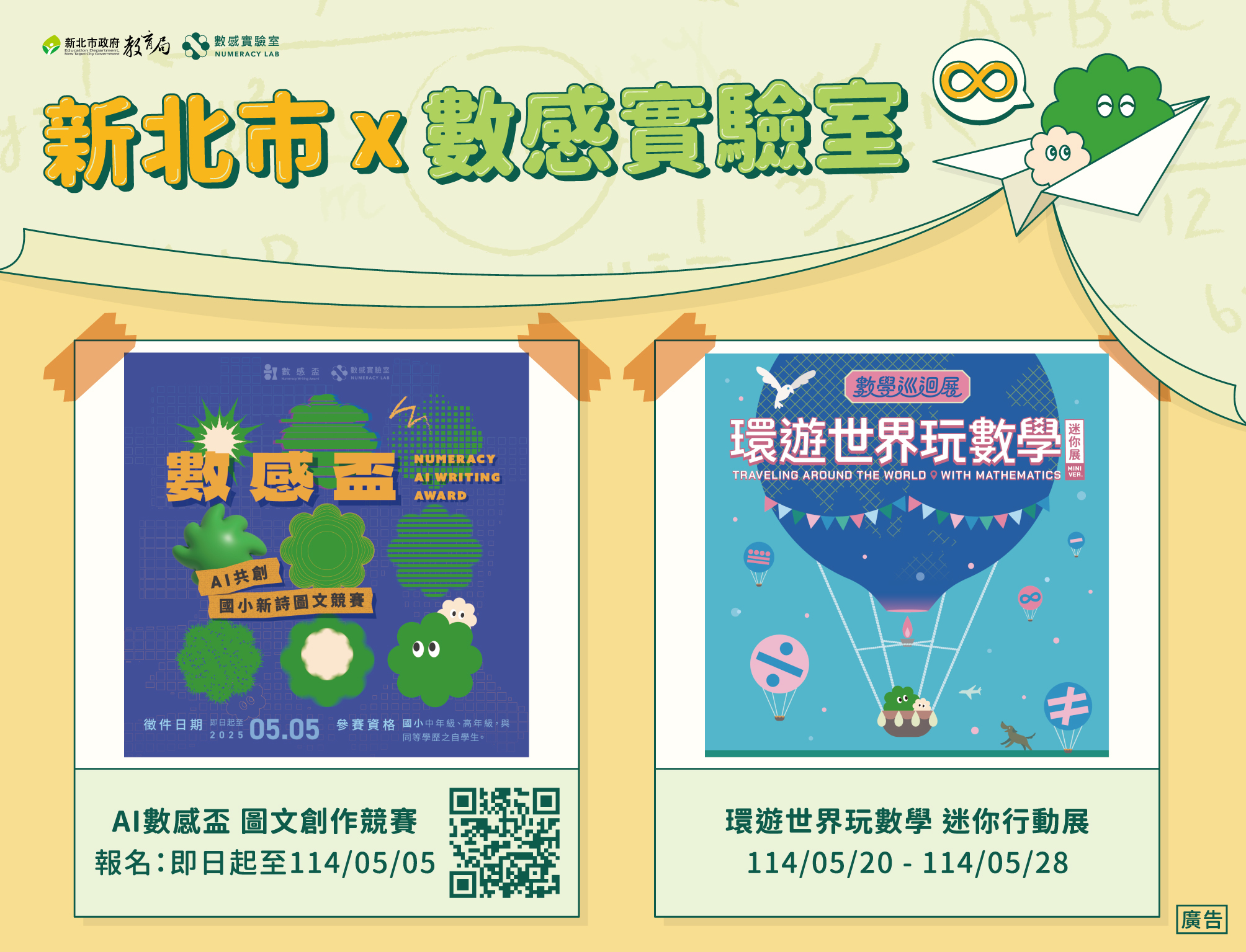 新北市教育局響應「2025新北環境季-i探索」主題,推出一系列兼具創意、知識與互動體驗的學習探險活動,包括AI與詩文創作融合的「數感盃AI共創國小新詩圖文競賽」、新北限定「環遊世界玩數學」迷你行動展,以及於台灣電力公司電幻1號所舉辦的能源與永續議題的互動展演,期盼讓孩子們的學習不只發生在課堂,也能在詩裡激盪創意、在世界地圖上解鎖知識、在光影場域中感受科學魔力,一起開啟知識與永續的冒險之旅。