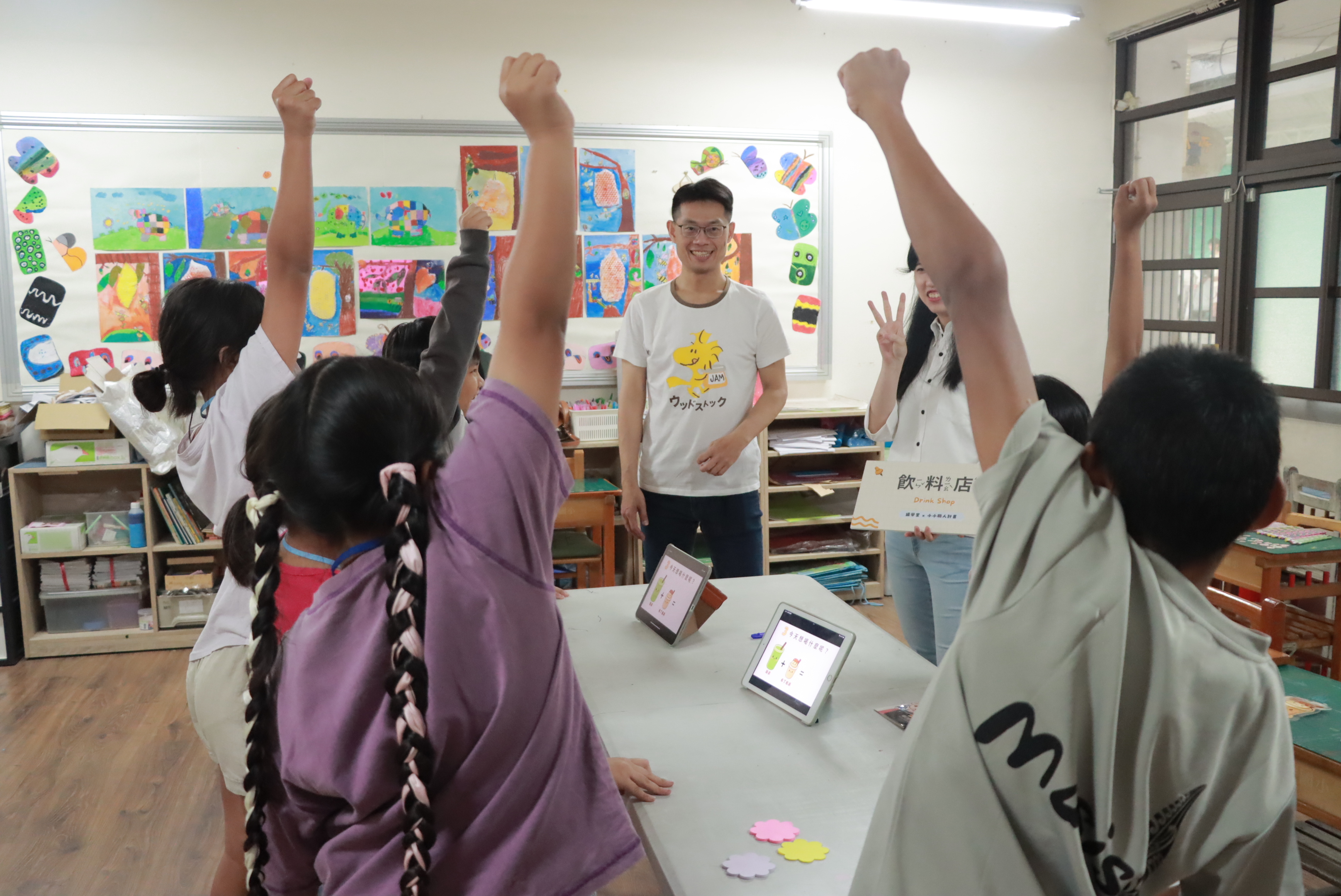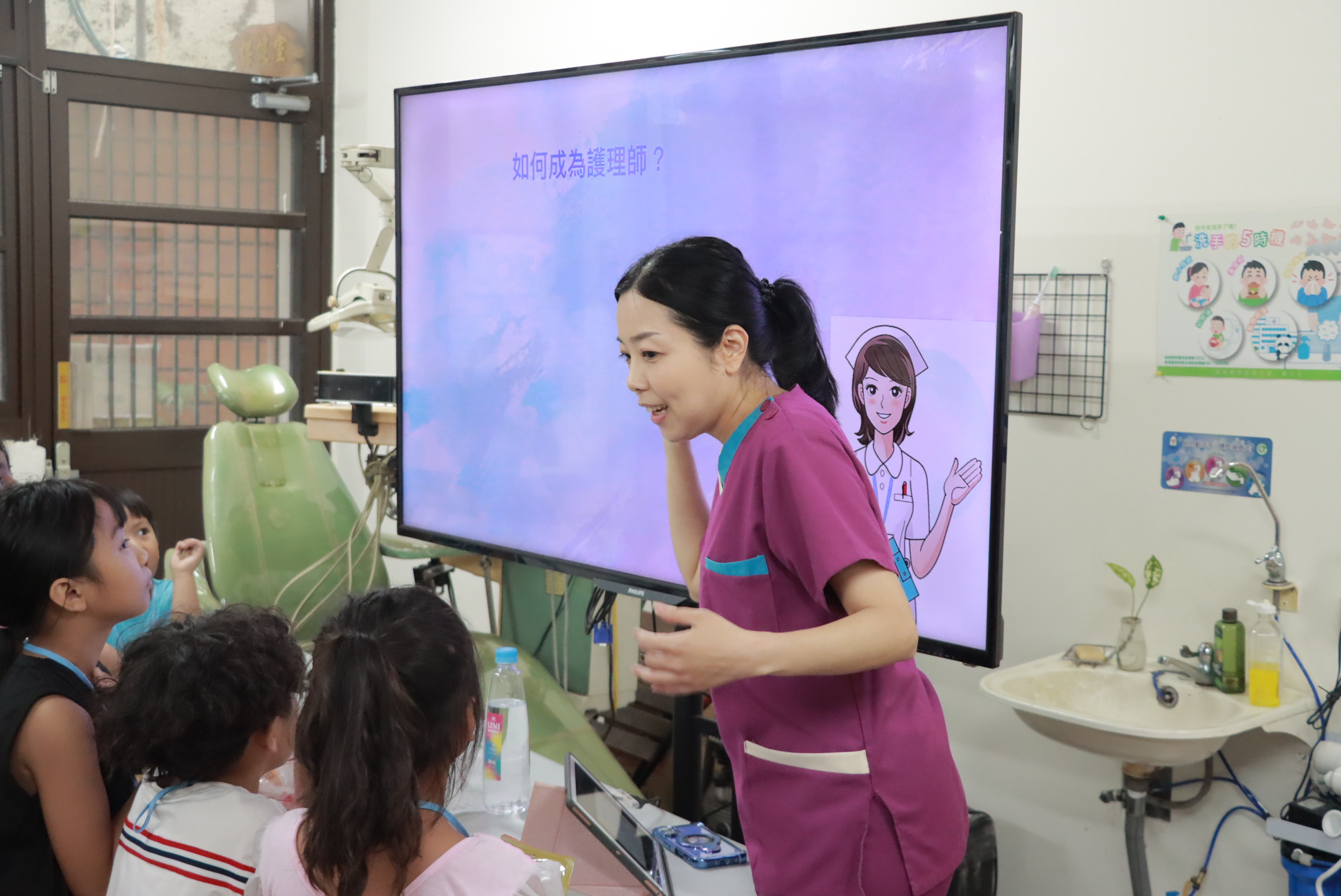此外還有「護理師攤位」,由護理師分享護理工作的內容及成為護理師所需具備的條件外,還介紹了健康飲食金字塔、身體界線等衛教知識,讓孩子學習自我照護,並建立尊重自己與他人的正確觀念。「飲料店攤位」讓小朋友進行角色扮演,並結合算術挑戰,在遊戲中自然地練習邏輯運算,享受數學運算挑戰的樂趣。