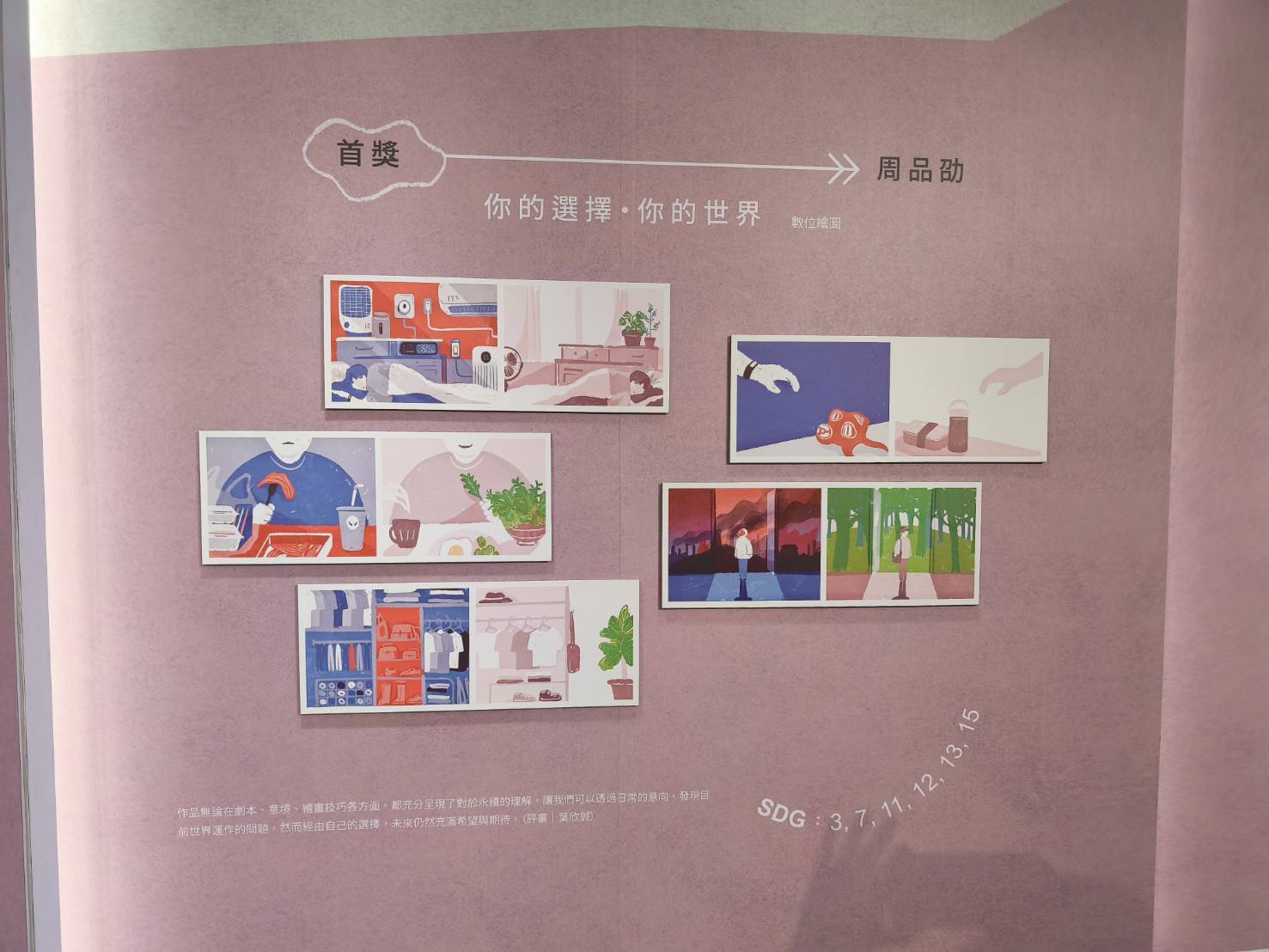 由周品劭創作的「你的選擇·你的世界」透過五幅連續圖像,展現主角從起床到出門的日常行為選擇,以對照方式,繪製出主角的選擇會呈現兩種完全不同的平行時空,藉此提醒環保與永續的重要性,獲得首獎肯定。評審林宇儂表示,首獎作品在永續性表現上明確且易懂,色彩配置和設計也令人驚艷,顯示出優秀的繪畫技巧和內容表現。