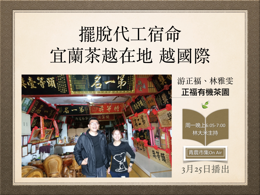 正福茶園的第四代接班人游正福和林雅雯,相信已經有很多聽眾喝過他們的有機茶,因為他們夫妻倆常常到各地農夫市集擺攤,要讓人重新認識宜蘭茶並不容易,早年宜蘭的茶園總是為人代工,將自己生產的好茶便宜賣給茶販,如今老茶農漸漸凋零,不忍下一代和自己一樣一生勞碌無功,都不期待孩子回鄉承接茶業,但正福茶園第四代,35歲的游正福,靠著打出品牌及堅持品質,聽夫妻倆談談這些年來一家人如何走出一條自己的路,為宜蘭茶開闢新局~