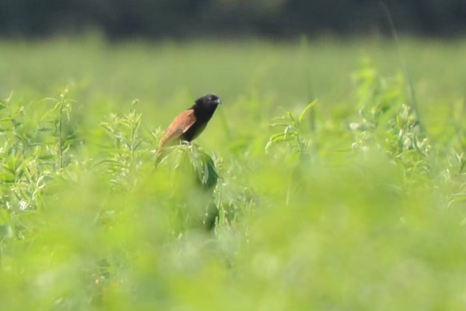 這天是2022年7月9日夏天小暑節氣,晴朗天氣的上午,從台中出發前往彰化縣二林鎮的甘蔗田。在這將近十甲地的甘蔗田,除了有丟丟銅仔的鳴叫聲,也可以聽到「窩、窩、窩、叩叩叩叩」鳴叫聲不絕於耳,這鳥兒一身黑色的靚裝,偶爾停留在高草莖上觀察四周,一會兒又隱身在甘蔗叢林裡鳴叫著。