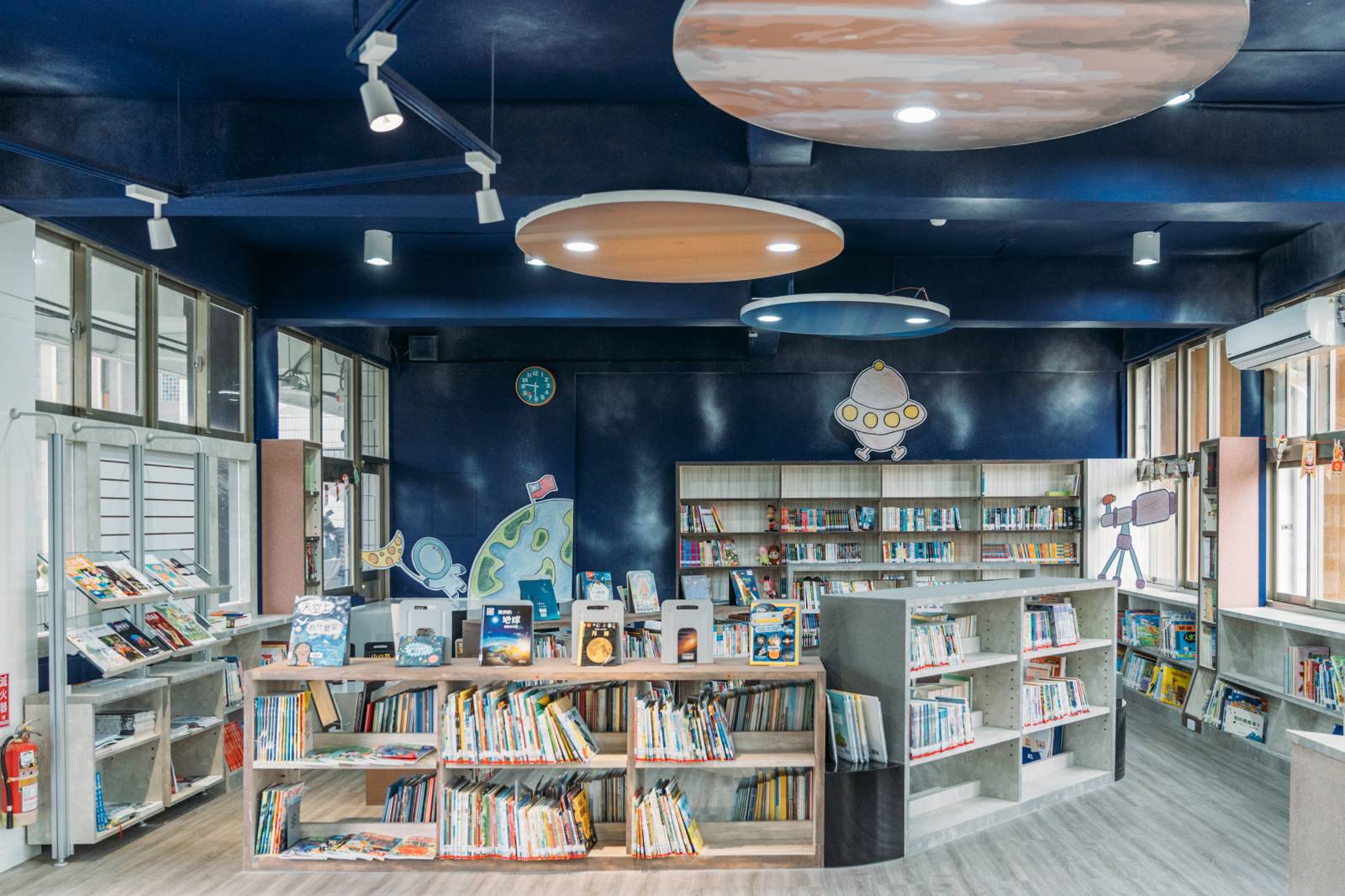 豐榮國小圖書館的創意點子來自於電影阿凡達Avatar呈現了潘多拉星球神秘的植物與動物,打造未來太空異形世界,營造「浩瀚星空」的意象,入口設計靜謐且科技感的太空意象,並增設新書展示櫥窗及還書櫃;大門口調整至三間教室的中間,降低室內圖書架的高度,所有的圖書擺設均移到周邊,服務臺移至中間,一邊可以管理藏書區,另一邊可服務孩子閱讀或教師教學需求,而太陽直射的角落,規劃主題活動展區,走廊玻璃門窗貼洞洞貼紙,可遮陽亦可透光,讓孩子愛上圖書館、更愛上閱讀。
