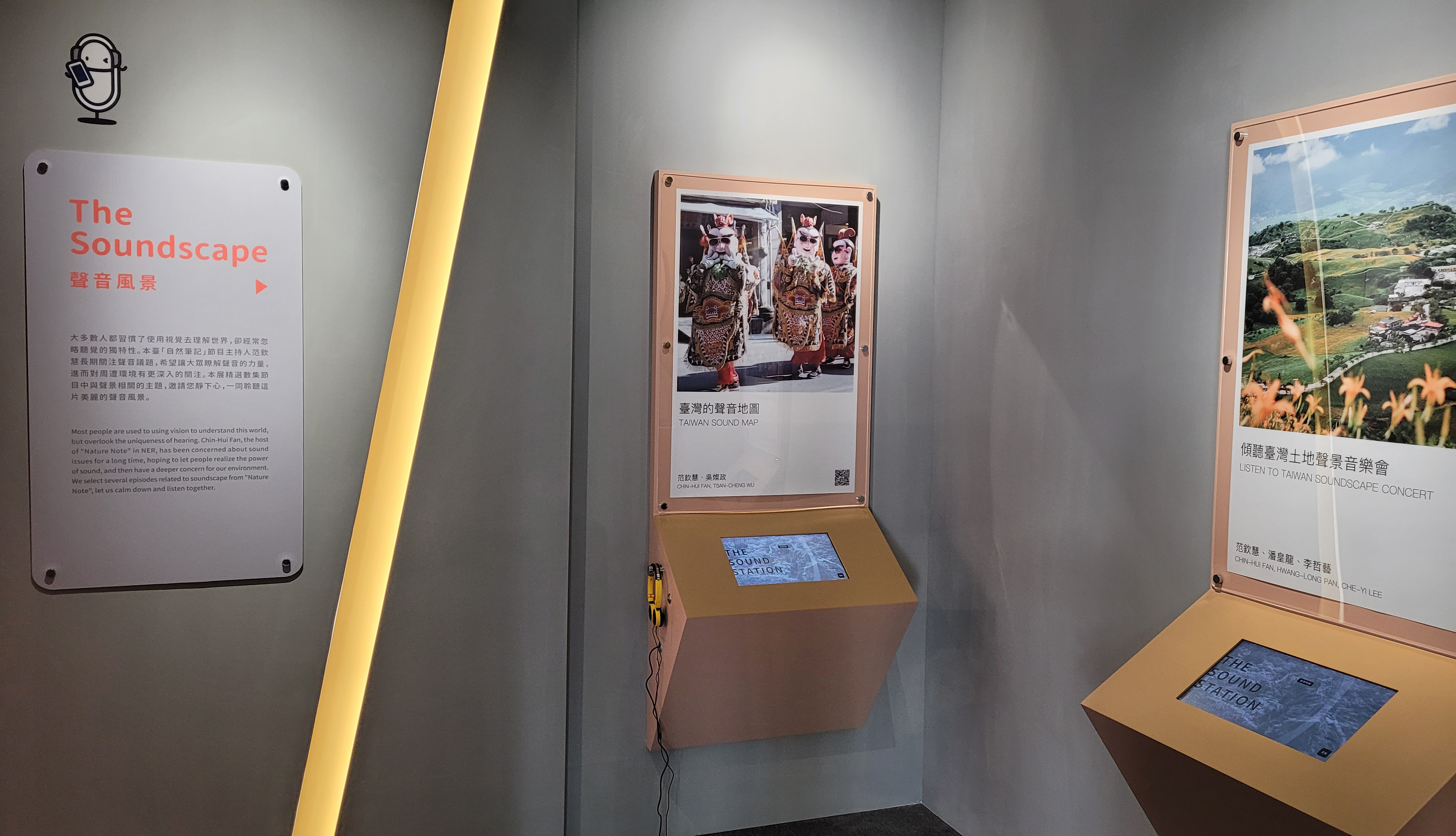 1樓的「聲音特展區」每期皆會依特殊的主題進行策展,讓觀眾可以在此細細聆聽不同聲音傳達出來的故事與文化。本期特展主題以本臺製播多年的節目─「自然筆記」為主軸,帶領大眾聽臺灣的「聲音風景」:多數人都用「視覺」去理解世界, 但卻忘了聲音的獨特性。臺灣這片土地有什麼聲音的故事呢?在這裡可以靜下心來,細細聆聽這片美麗的聲音風景。