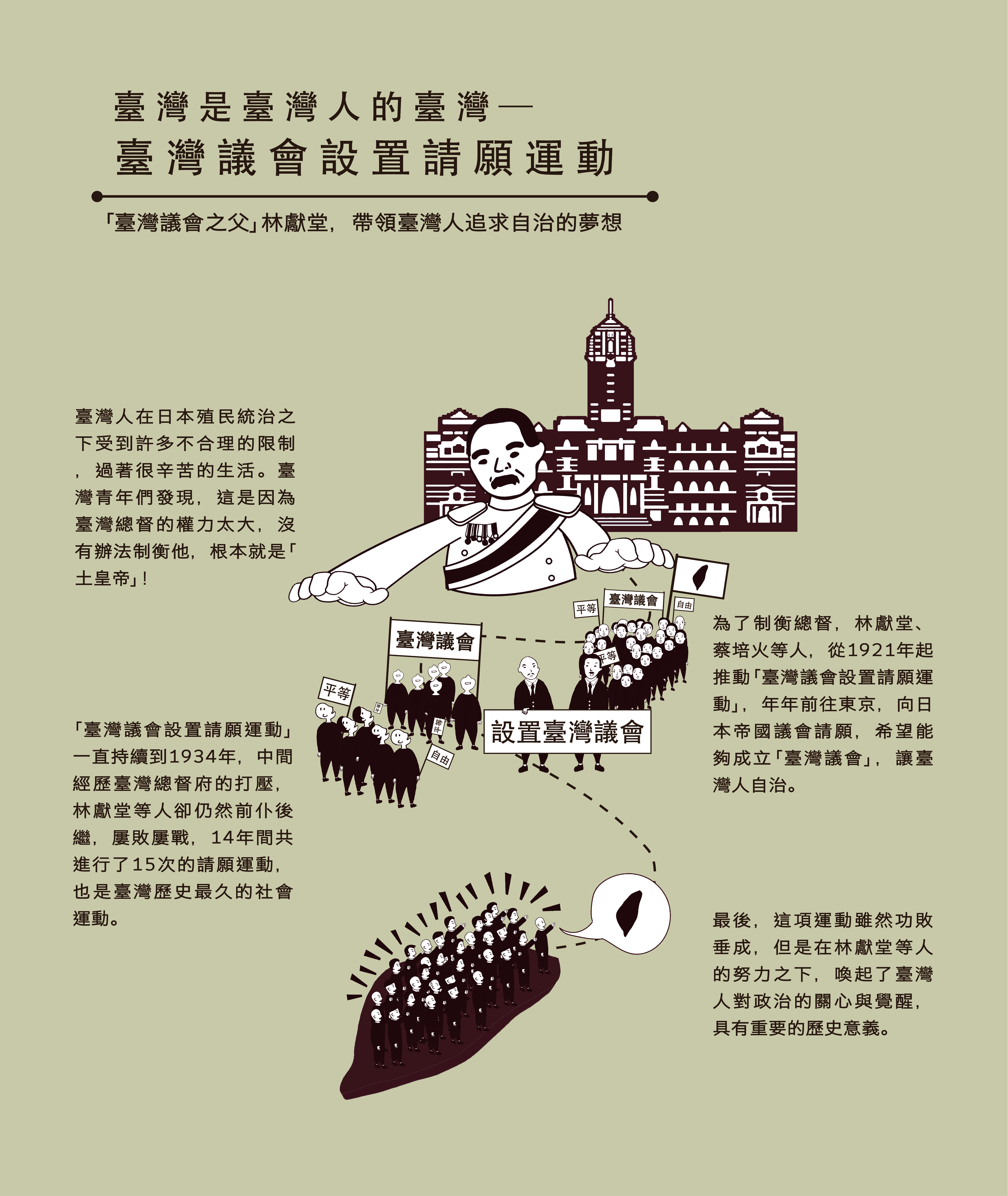 1920年「新民會」成立,由林獻堂先生擔任會長,目的在於從事政治社會改革運動,本意是推動喚醒台灣民眾參與政治運動(廢除六三法)和創立「臺灣青年」刊物等。在此之後改變方向,以讓臺灣擁有高度自治權,推動成立「臺灣議會」,也就是民主運動史上重要的臺灣議會設置請願運動,進而影響蔣渭水先生,進而成立臺灣文化協會,兩人一起推動臺灣文化運動啟蒙臺灣民眾心智。