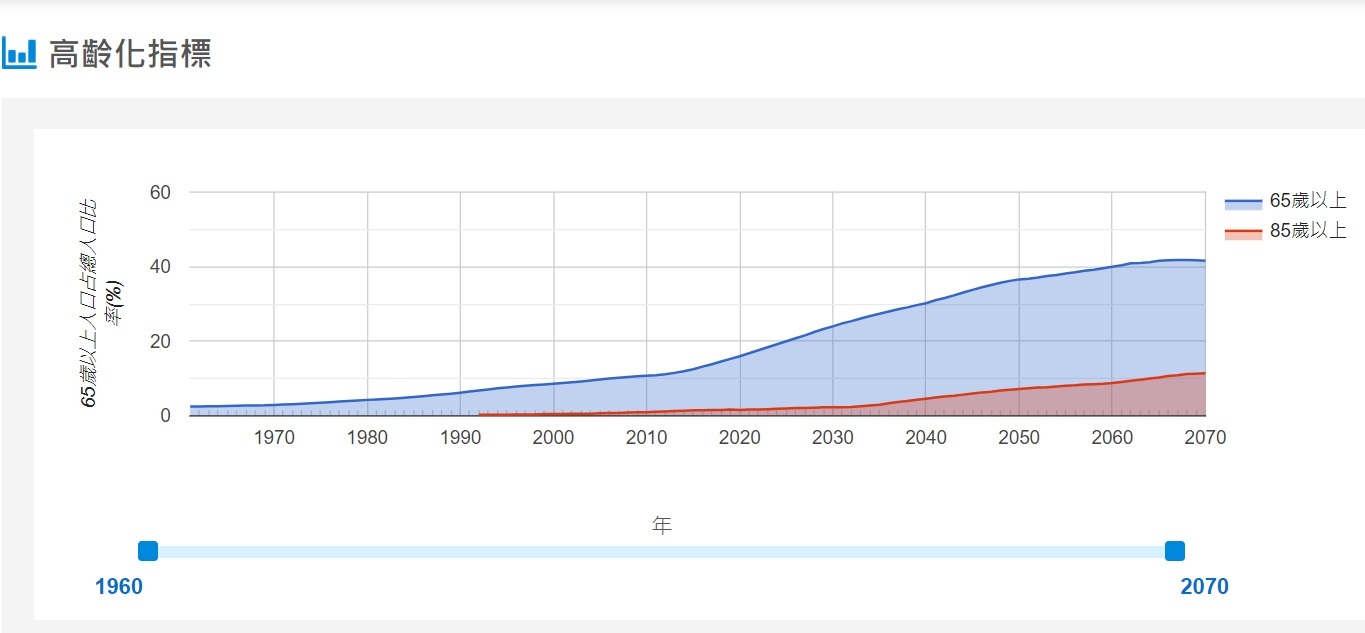 根據國家發展委員會統計,臺灣預計在2025年邁入超高齡社會;至2070年,超高齡(85歲以上)的人口將從2020年的10.3%增長至27.4%。