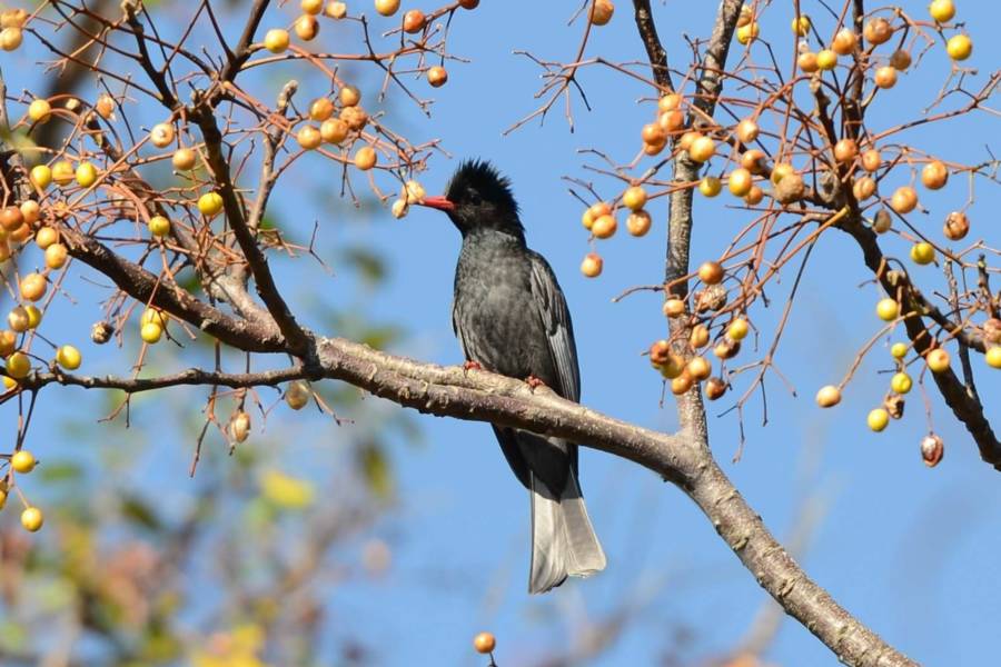 這天是2021年11月29日冬天小雪節氣 晴朗天氣的上午,從台中前往海拔600-1200公尺左右的大雪山中坑,我們開車經過國道1號、國道4號接省道3號前往東勢區,接著來到大雪山山腳下的中坑國小,沿著狹窄產業道路推進大約5公里,來到遍植甜杮的山林間,感受淡淡甜甜的甜杮香氣,我看到一群2,30隻黑漆漆的鳥兒停留在一棵大樹上喧鬧著,不時鳴叫著像貓咪~喵~喵的叫聲。